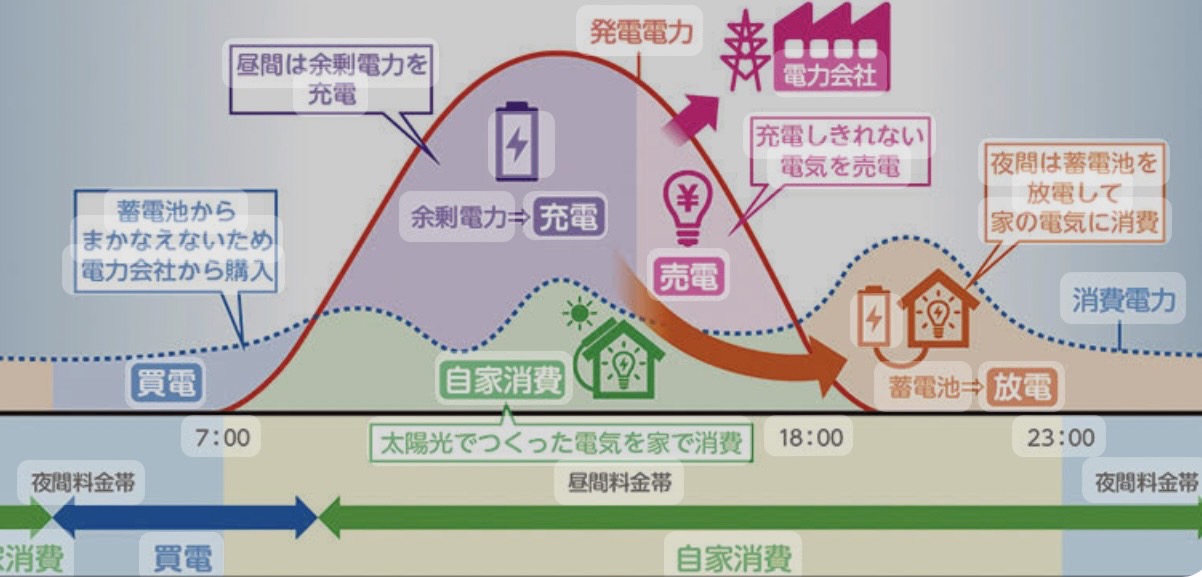 既に太陽光を搭載している方ならば、日中に太陽光発電で生成した電気を使用し、夜間は電力会社の安価な夜間電気を利用することによって、電気代を抑える事が可能になります。